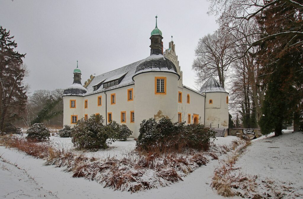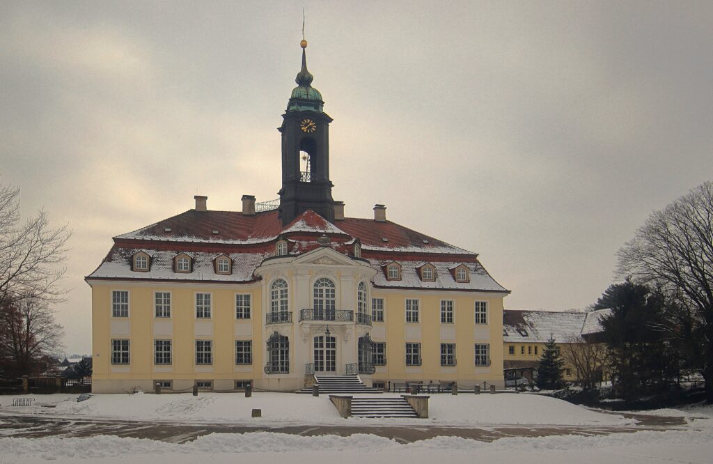 Noch liegt das Schloss Wiepersdorf im tiefen Winterschlaf, gerade verzieht sich der Morgennebel und die ersten Sonnenstrahlen geben den Blick frei auf die winterliche Schlossanlage