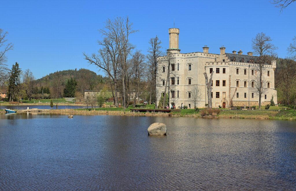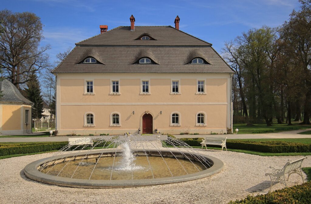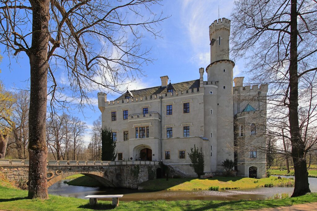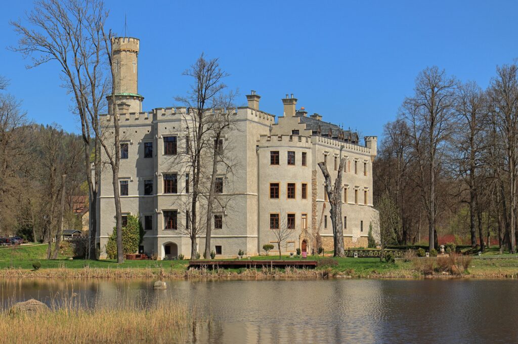 Das Schloss Fischbach im Hirschbergertal in Karpniki ein ehemals von preussischen Königen errichtetes Schloss, heute ein Hotel eingebettet in eine Teichlandschaft