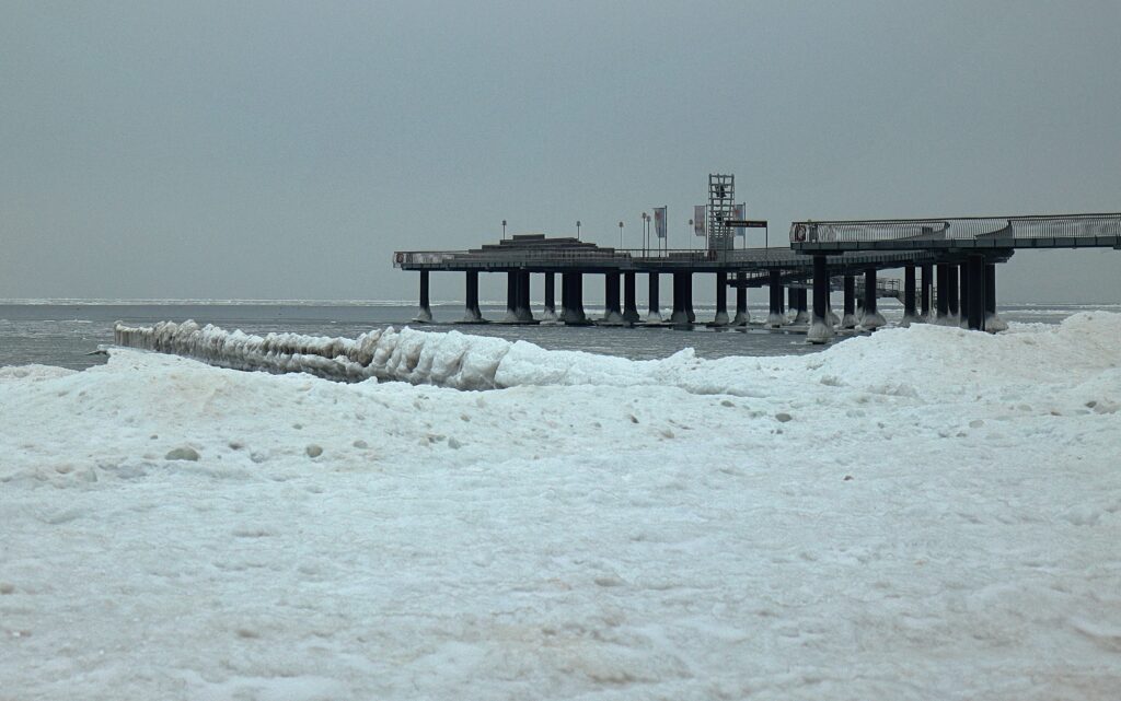 Eis , soweit das Auge reicht. Die Seebrücke Koserow fest im Griff des Winter